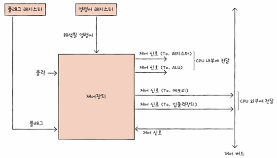 - 제어장치는 기본적으로 제어신호를 내보내게 되는데 CPU내부 (ex 레지스터, ALU) 에 전달하는 제어신호와 CPU외부 (ex메모리, 입출력장치) 에 전달하는 제어신호가 있다.