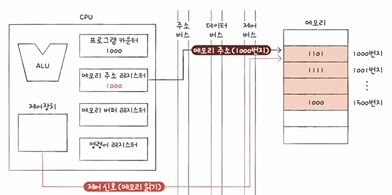 · 메모리에게 (제어장치를 통한) 메모리 읽기 신호와 함께 몇 번지 주소를 읽고 싶은지를 쏴주게 된다.