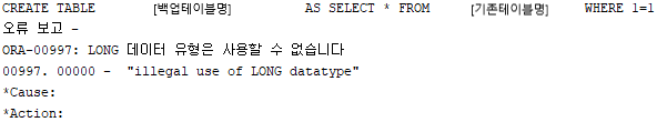 3. COPY FROM UserId/UserPw@sid TO UserId/UserPw@sid CREATE [๋ฐฑ์ ํ ์ด๋ธ๋ช ] USING SELECT * FROM [๊ธฐ์กดํ ์ด๋ธ๋ช ]